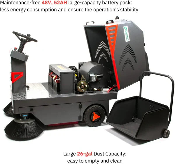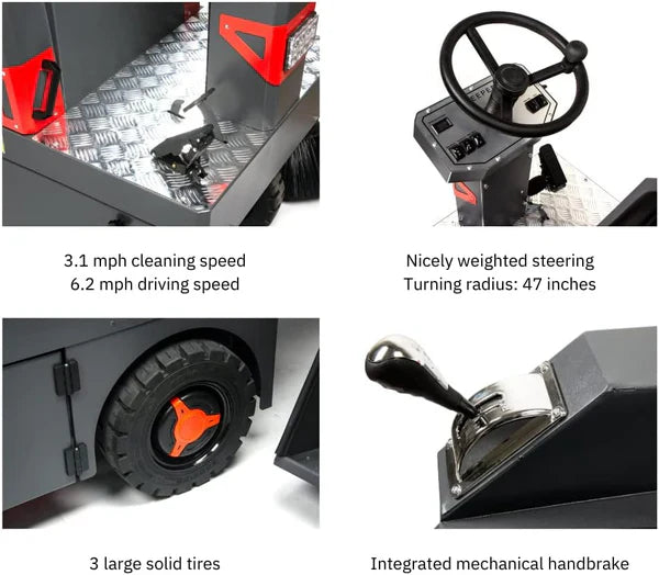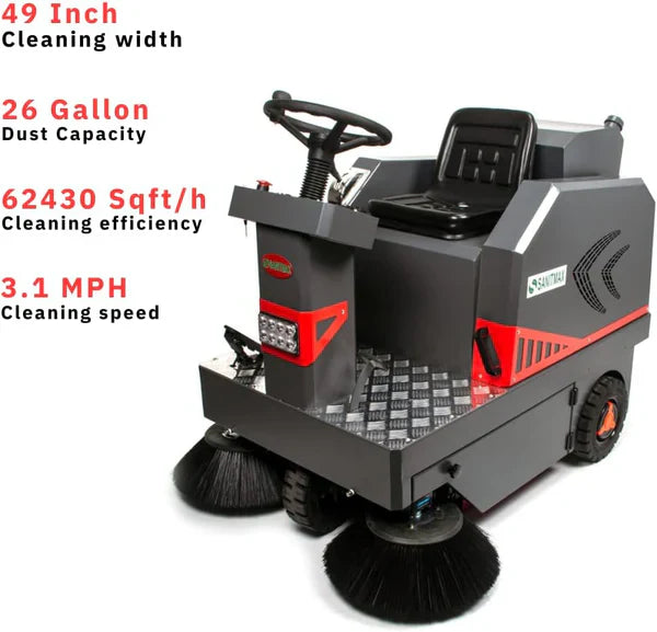 Discover the SM1250 49" Ride-on Industrial Floor Sweeper, a top choice for keeping large spaces like warehouses and manufacturing facilities clean and tidy. This ride-on industrial floor sweeper is designed to work hard, so you don’t have to. It sweeps and vacuums simultaneously, meaning it cleans faster and more thoroughly than traditional methods.